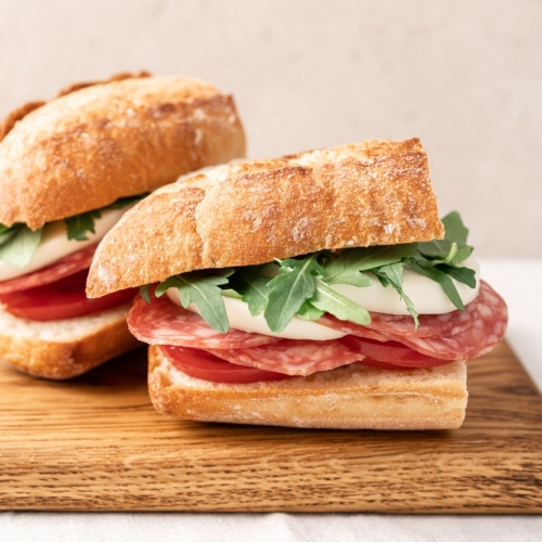 Serrano ham with homemade pesto, arugula, tomatoes, red onions, and cucumber.